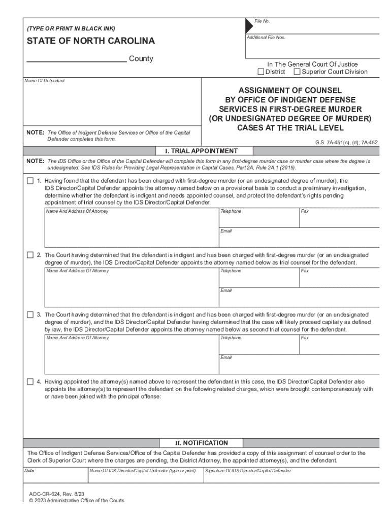 Assignment Of Counsel By Office Of Indigent Defense Services In First-Degree or Undesignated Degree of Murder Cases: This is an official form from the North Carolina Administration of the Courts