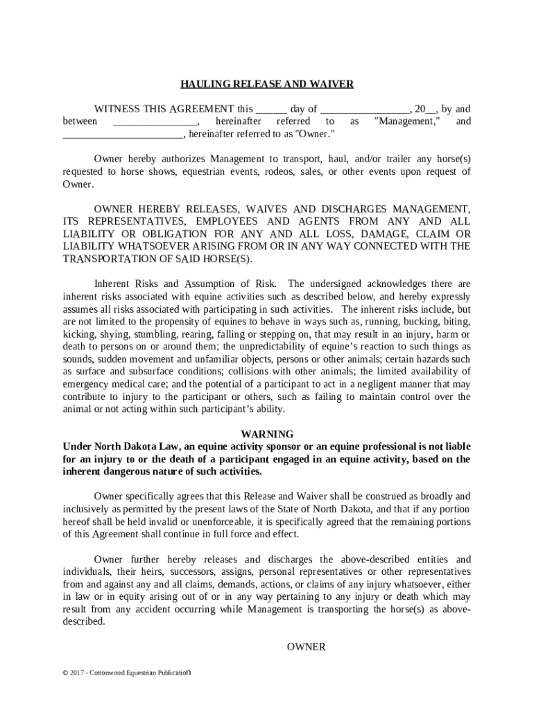 Get the free Hauling Release and Waiver - Horse Equine s template