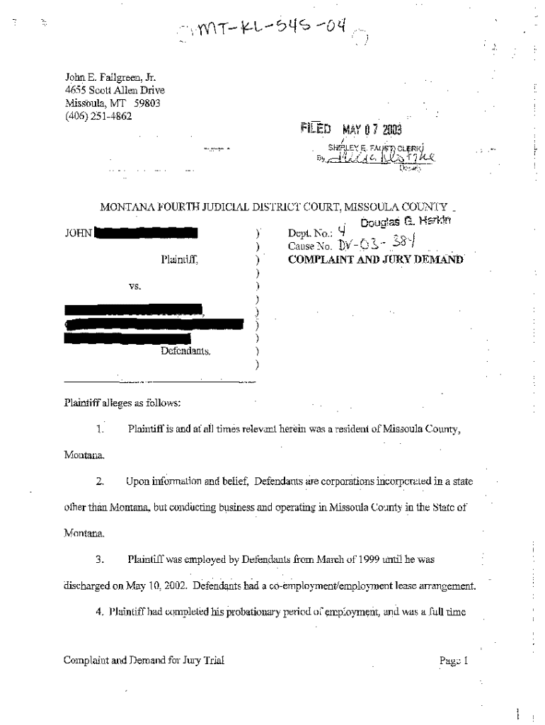 A01 Complaint and Jury Demand regarding Wrongful Termination