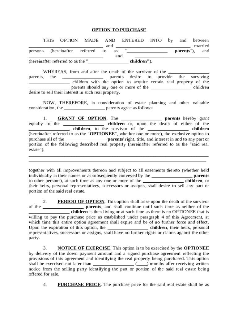 This option agreement is between two married persons who are parents of children to whom an option to purchase the property is given. Terms for purchase are detailed including the time period, the