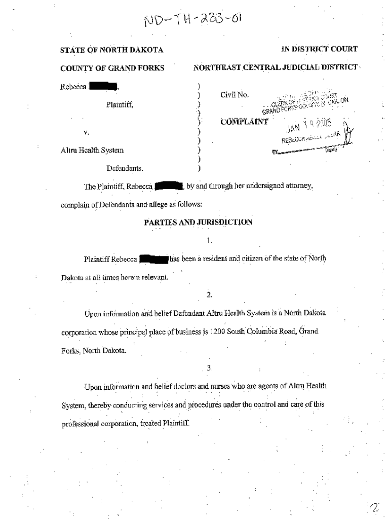 Get the free A01 Complaint for Medical Malpractice Where Patient's Respirator was Secured Too Tig...