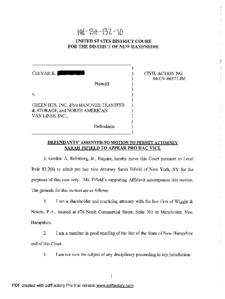 Get the free A10 Defendant's Assented-to Motion to Permit Attorney to Appear Pro Hac Vice