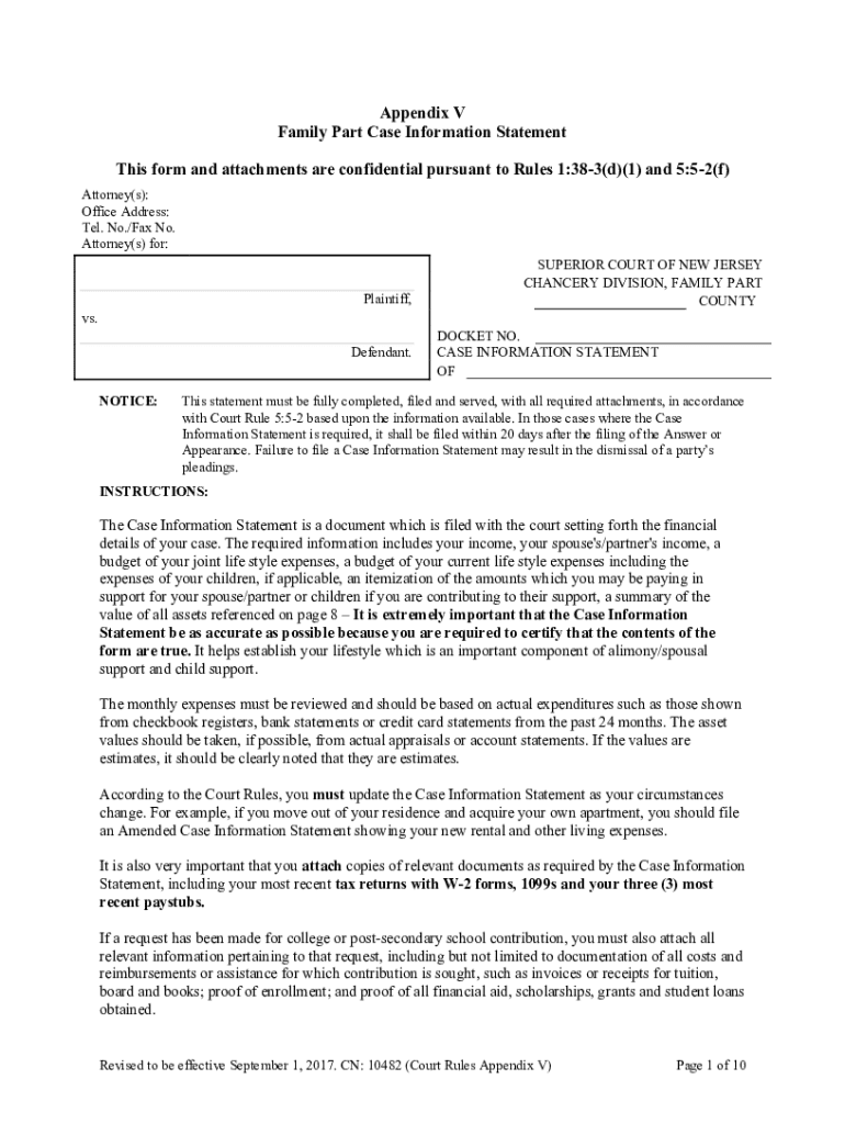 Family Part Case Information Statement: Thise is an official informational document for the courts files. You may be required to file this when filing your Complaint and other initial documents.