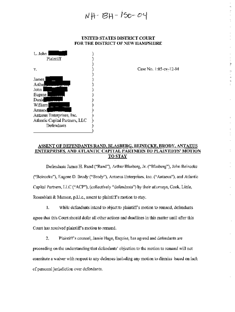 A04 Assent of Defendants to Plaintiffs' Motion to Stay