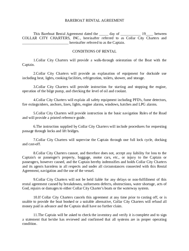 A bareboat rental agreement is a contract allowing a renter, or Captain, to operate a vessel without crew. This arrangement is significant as it offers independence while ensuring clarity on responsibilities and liabilities between the renter and the rental company, such as Collar City Charters.