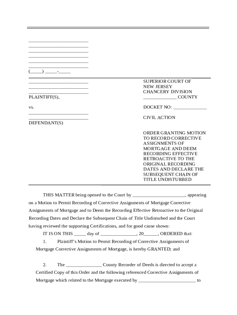This guide provides a comprehensive overview of the order granting motion to form form and how to successfully navigate the process. Whether you need to correct assignments of mortgage or fil e a new motion, following this procedure can save you time and help ensure compliance with New Jersey court rules.