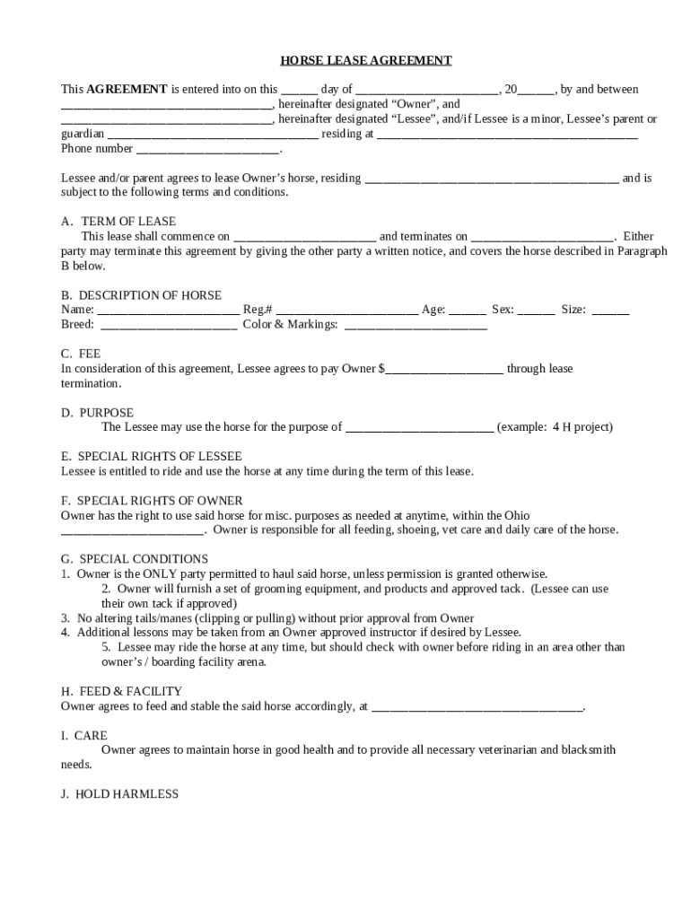 An Ohio horse lease agreement is a legal document outlining the terms between a horse owner and a lessee for the leasing of a horse.