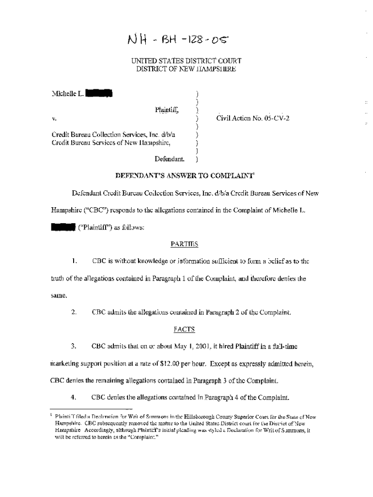 Get the free A05 Defendant's Answer to Complaint