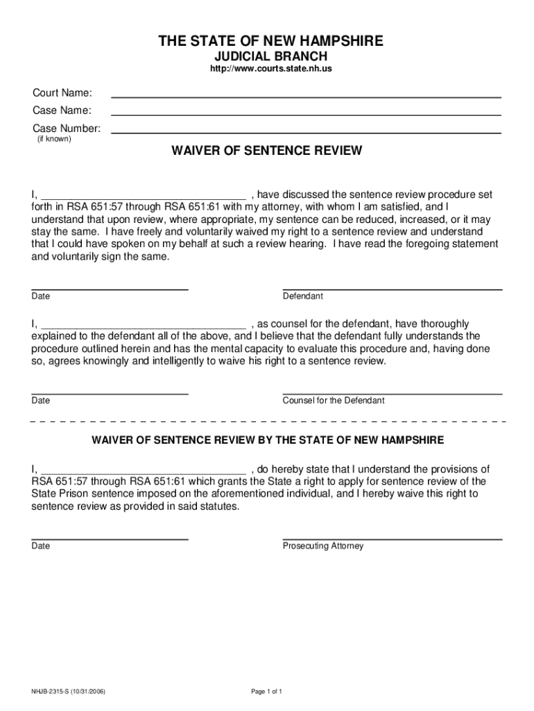 This is an official form from the New Hampshire Judicial Branch that is completed by defendant and/or State of NH prosecuting attorney and is acknowledging a waiver of the sentence review process.