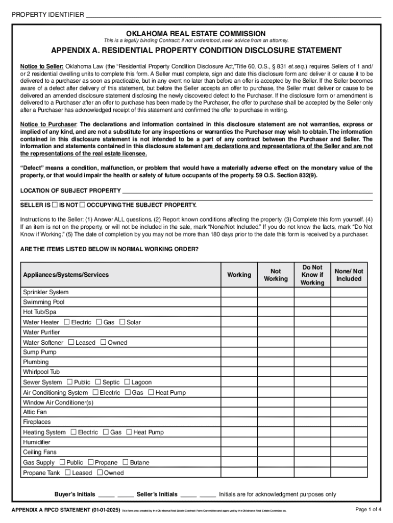 This form is a Seller's Disclosure Statement for use in a residential sales transaction in Oklahoma. This disclosure statement concerns the condition of property and is completed by the Seller.