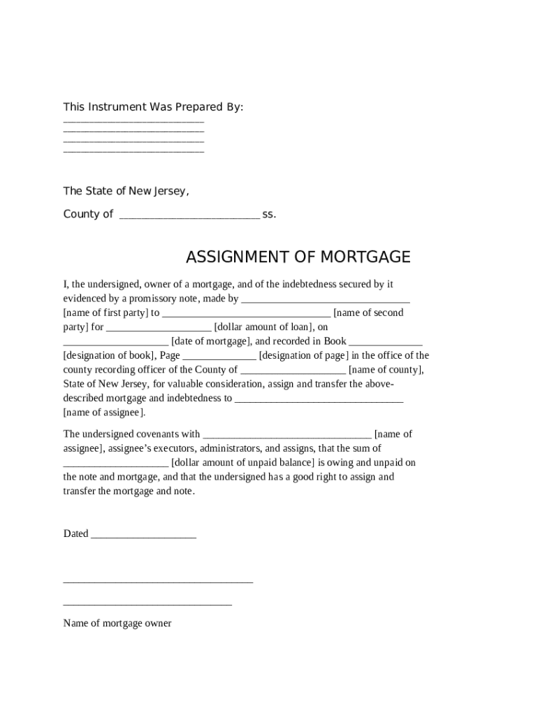 This is an assignment of mortgage/deed of trust form where the owner of the mortgage assigns and transfers the mortgage to a third party. The assignor covenants that the balance states is owning and