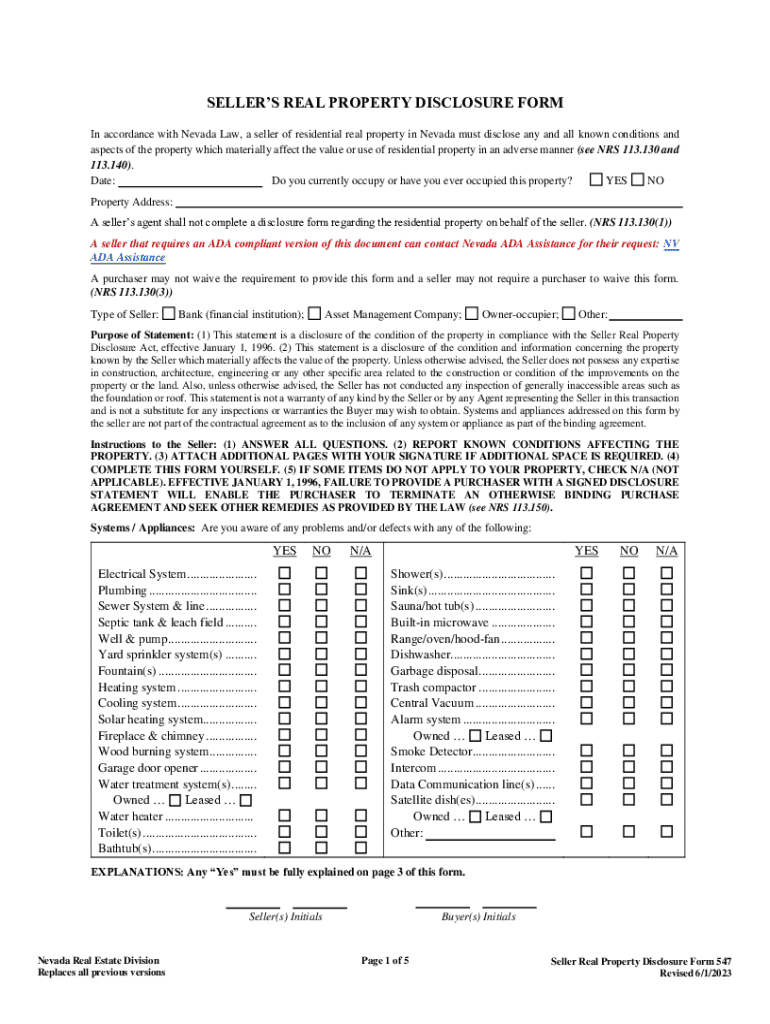 This form is a Seller's Disclosure Statement for use in a residential sales transaction in Nevada. This disclosure statement concerns the condition of property and is completed by the Seller.
