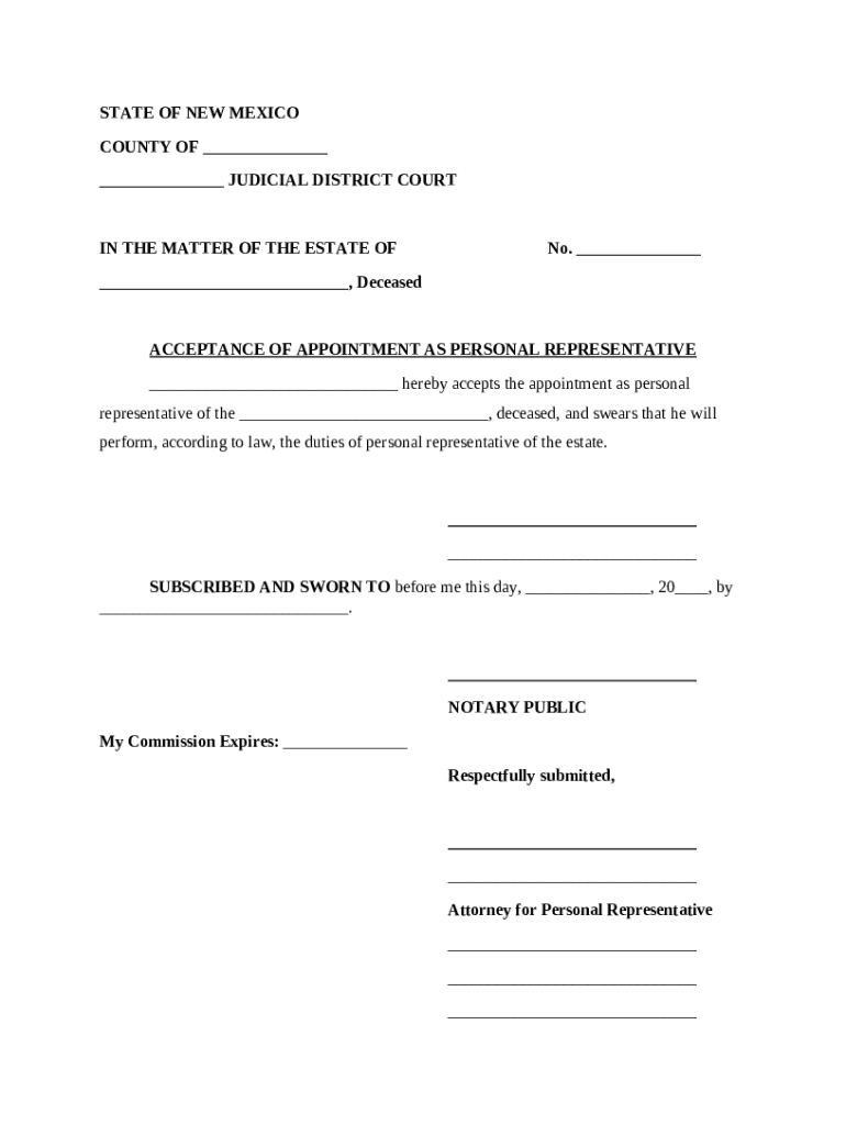 A statement confirming the acceptance of duties as Personal Representative is essential for legality.