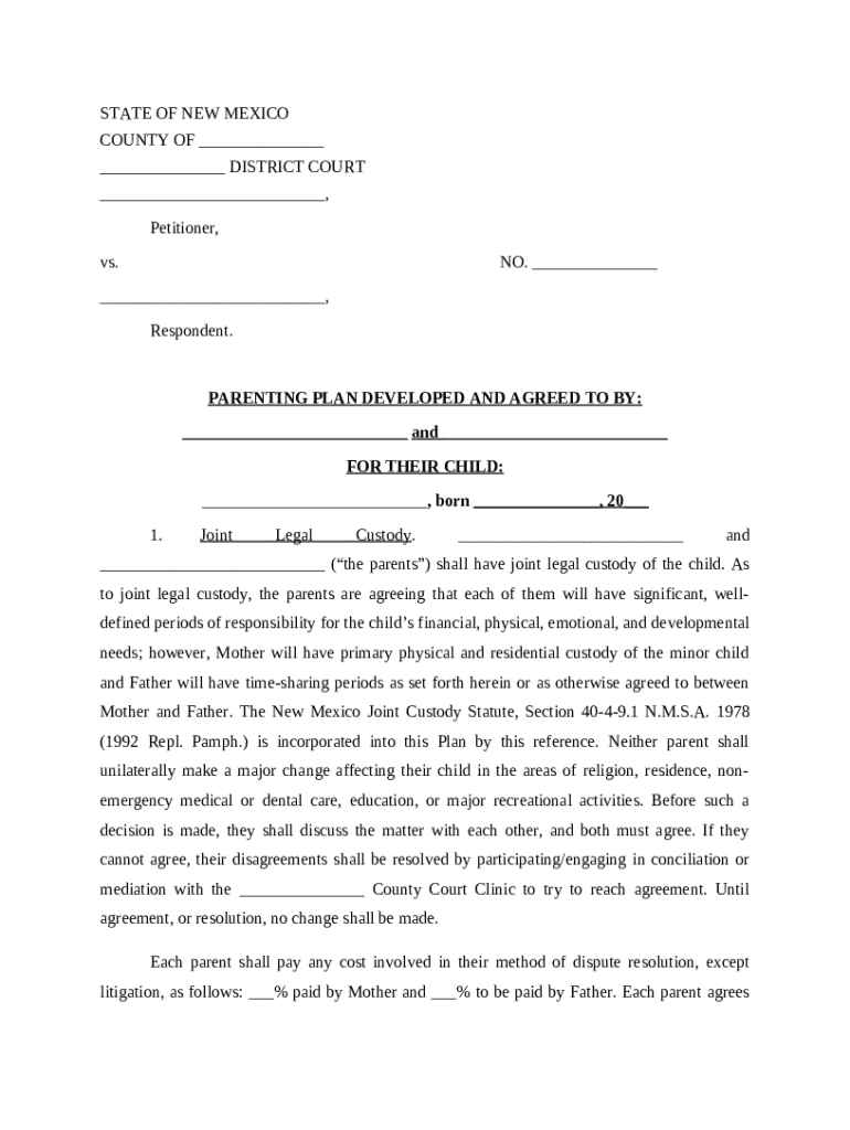 A parenting plan is a detailed document that outlines the responsibilities and rights of each parent regarding their child. It plays a crucial role in co-parenting, ensuring that both parents have a clear understanding of how decisions regarding the child's welfare will be made. In New Mexico, having a well-structured parenting plan can prevent conflicts and provide a foundation for communication.