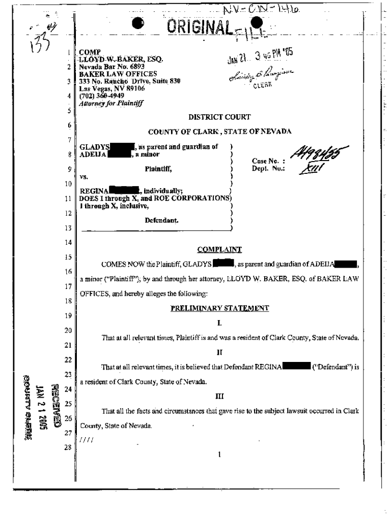 Get the free Complaint - Personal Injury Due to Dog Bite from Dog with Vicious Propensities