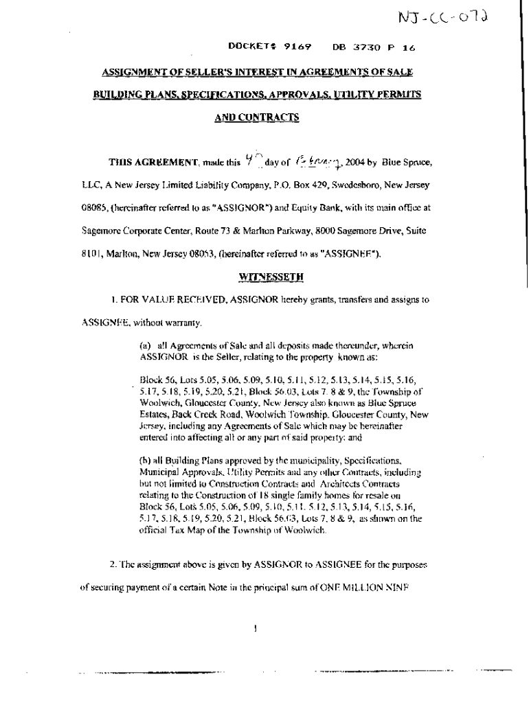 Assignment of Seller's Interest In Agreements Of Sale Building Plans