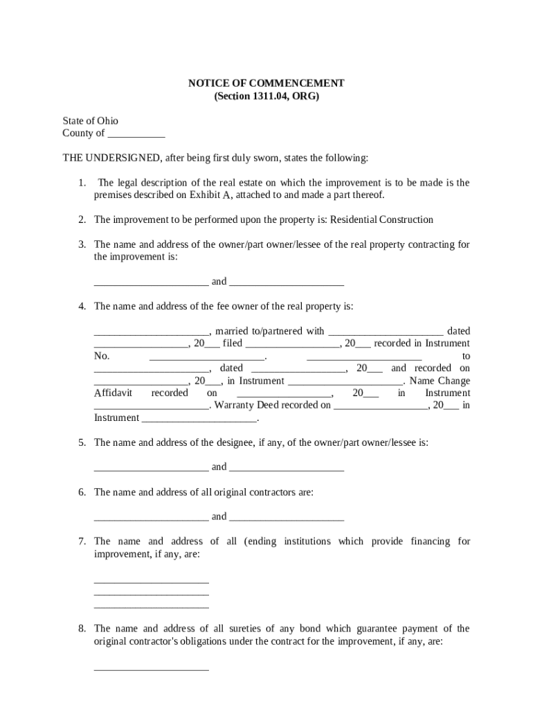 The notice of commencement form is a crucial document for any construction project in Ohio. It signals the official start of a project and establishes legal rights relating to mechanics’ liens. Understanding how to properly complete and file this form is essential for property owners and contractors alike.