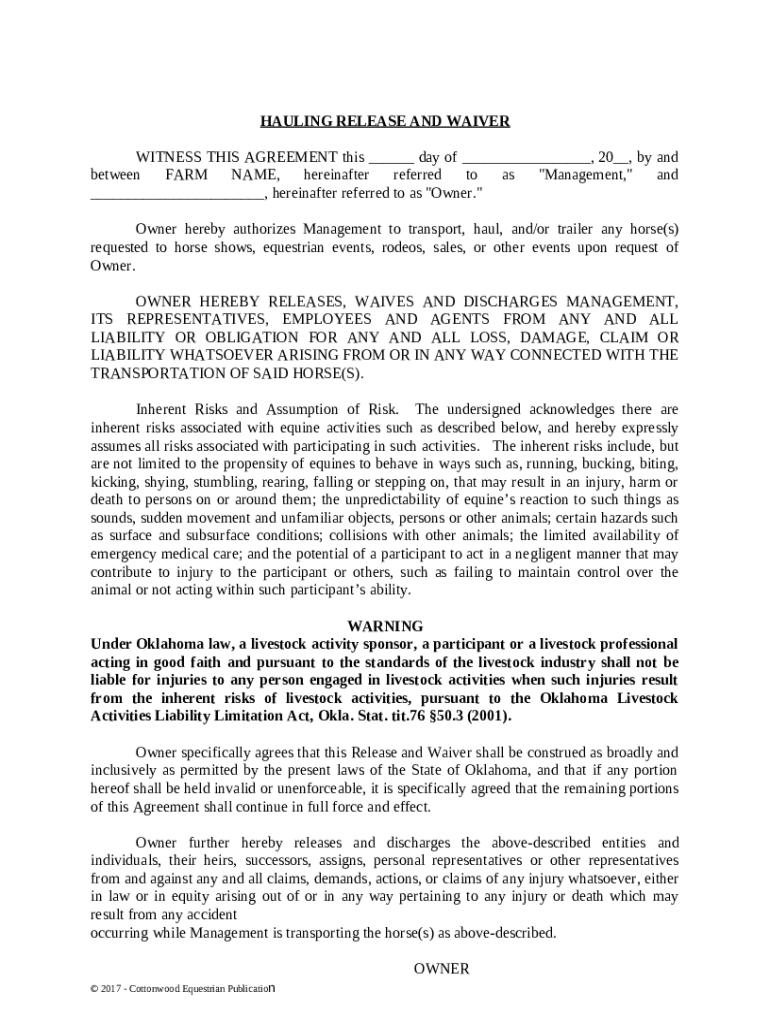 This Hauling Release and Waiver Horse Equine Form is a hauling release and waiver used in the situation where a horse owner agrees to allow another person to transport, haul and/or trailer a horse