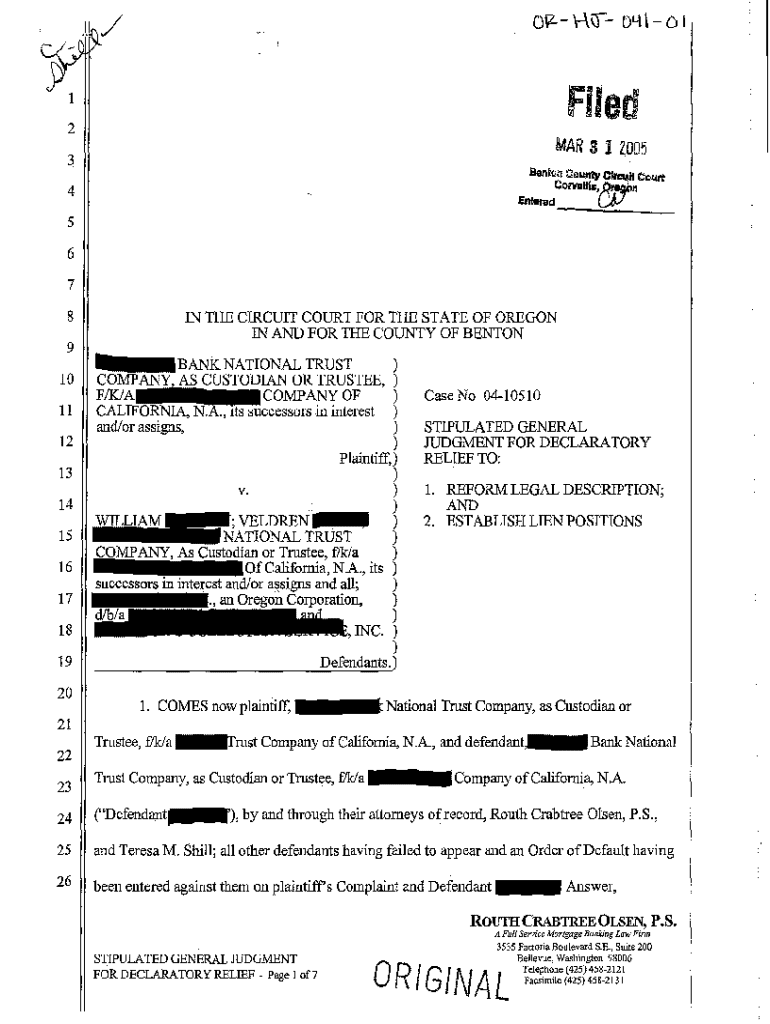 A26 Stipulated General Judgment for Declaratory Relief to Reform Legal Description and Establish Lien Positions