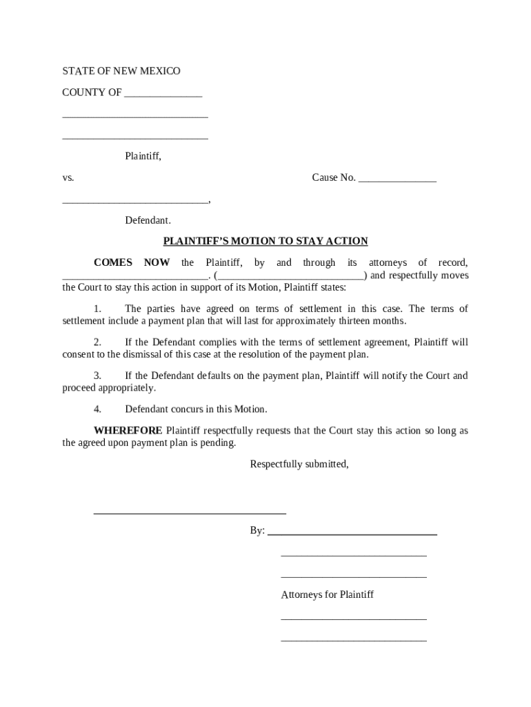 Get the free Plaintiff's Motion to Stay Action template