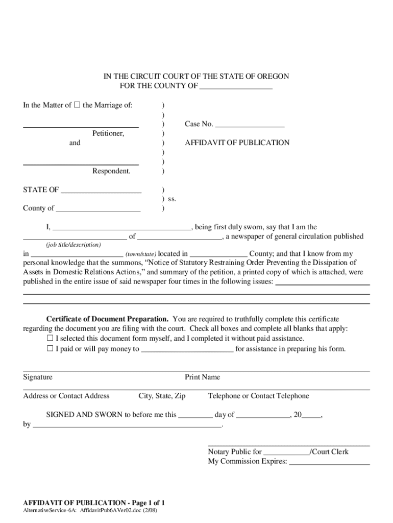 This is a sample Oregon court form for use in domestic litigation, an Affidavit of Publication. Available in Word format.