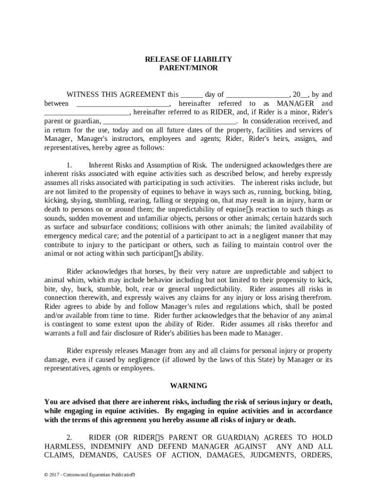 Get the free Release of Liability Parent Minor - Horse Equine s template
