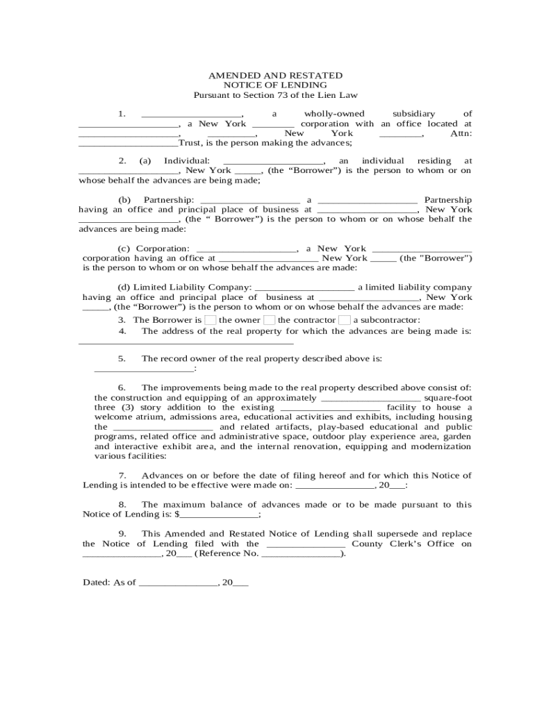 This form is an amendment of the notice of lending as described in Section 73 of the Lien Law, in form and substance reasonably satisfactory to the Administrative Agent.