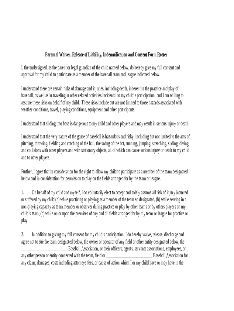 Get the free Parental Waiver, Release of Liability, Indemnification and Consent for Baseball Rost...