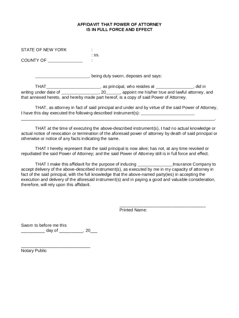 The power of attorney document empowers an individual (the principal) to designate another person (the agent) to act on their behalf in legal or financial matters. This document is critical for individuals who may be incapacitated or unavailable to manage their affairs. The affidavit asserting the current validity of this document ensures that third parties recognize the agent's authority.
