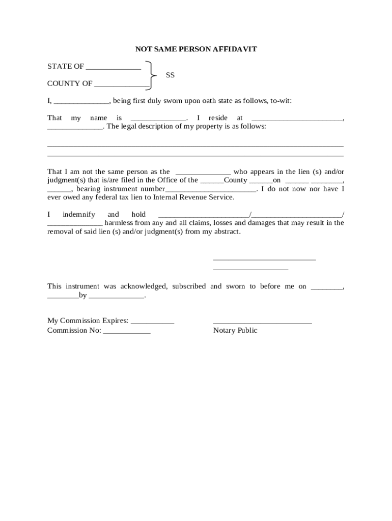 A not same person affidavit is a legal document affirming that two individuals are not the same person, often used to clarify identity issues in legal proceedings.