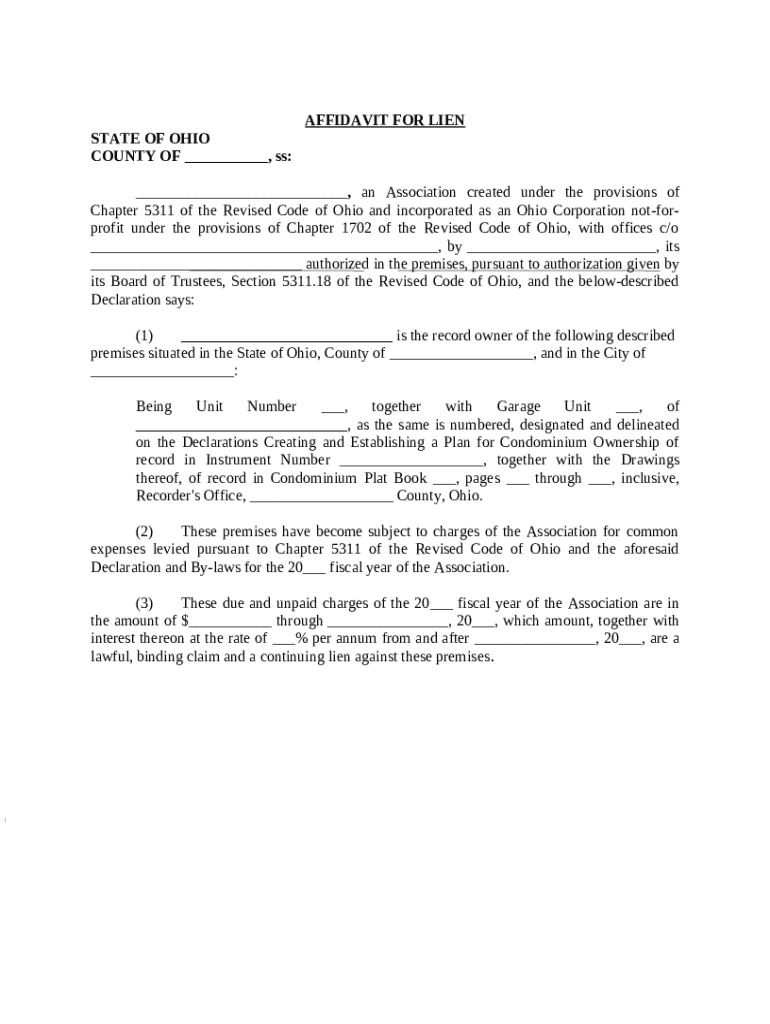 An affidavit of lien is a legal document that demonstrates the association's claim against a property due to unpaid charges. It is critical in establishing the association’s rights over the property when owners fail to meet their financial obligations. Understanding its importance is essential for property owners, particularly in Ohio where adherence to legal statutes is necessary.