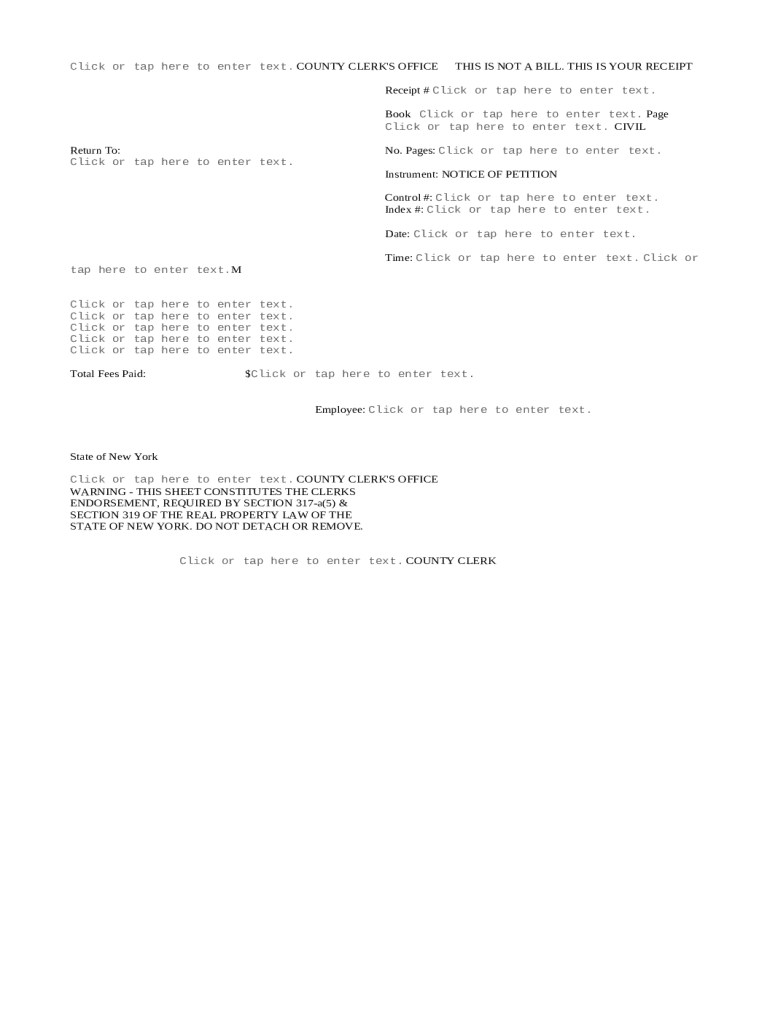The most crucial fields include the COUNTY CLERK'S OFFICE, CIVIL Return To No Pages, and details specific to the petitioner and respondents.