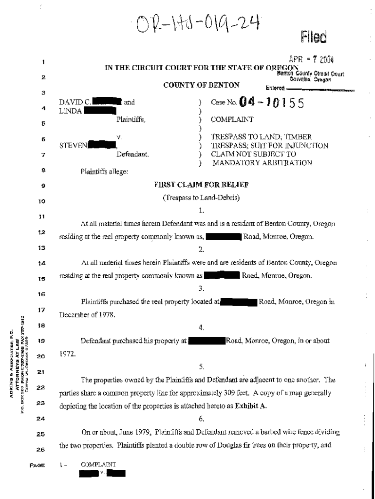 A01 Complaint for Trespass to Land, Timber Trespass, and Suit for Injunction