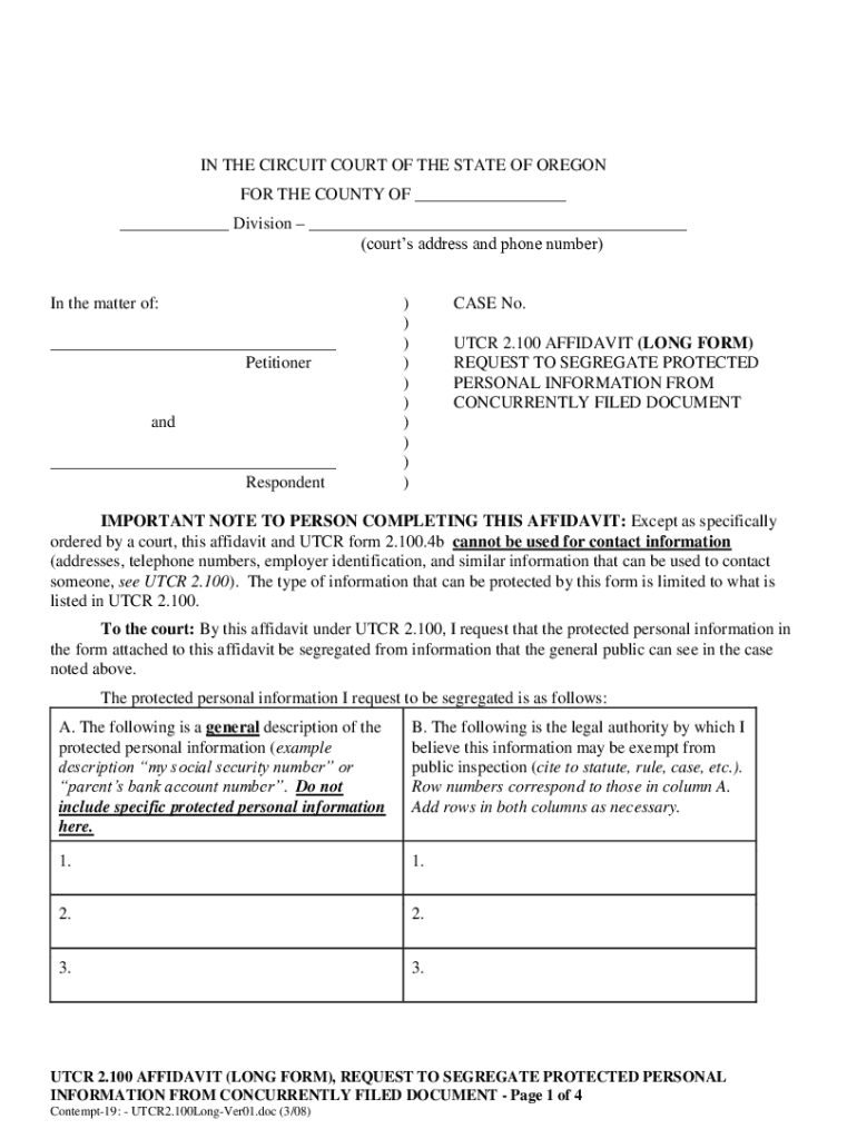 Get the free UTCR 2.100 Co-Petitioner (with no or adult children) Affidavit with Request to Segre...