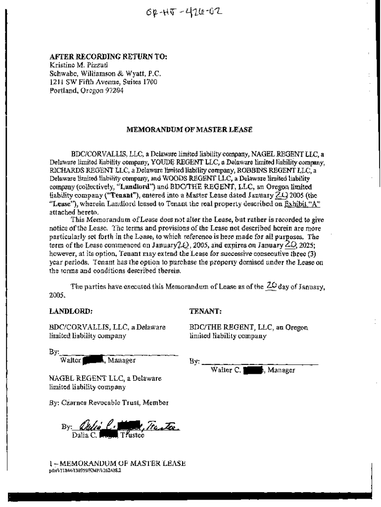 Get the free A02 Memorandum of Master Lease