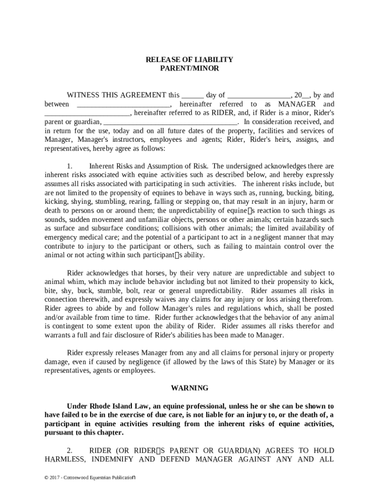 Get the free Release of Liability Parent Minor - Horse Equine s template