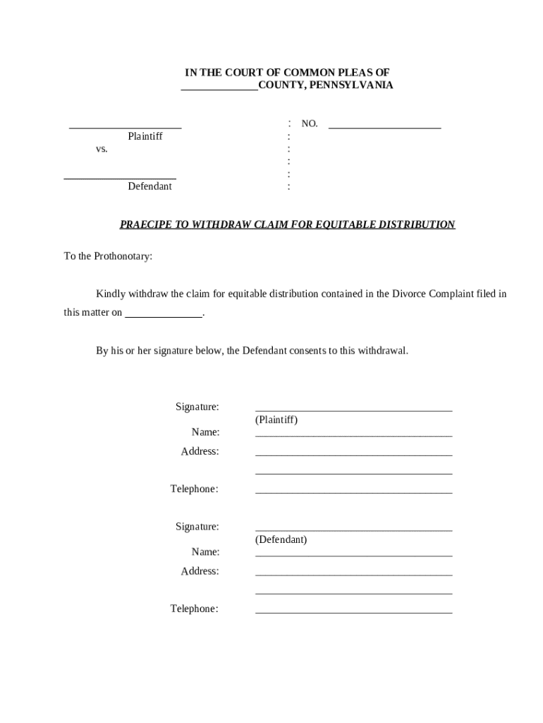 Get the free Praecipe to Withdraw Claim for Equitable Distribution template