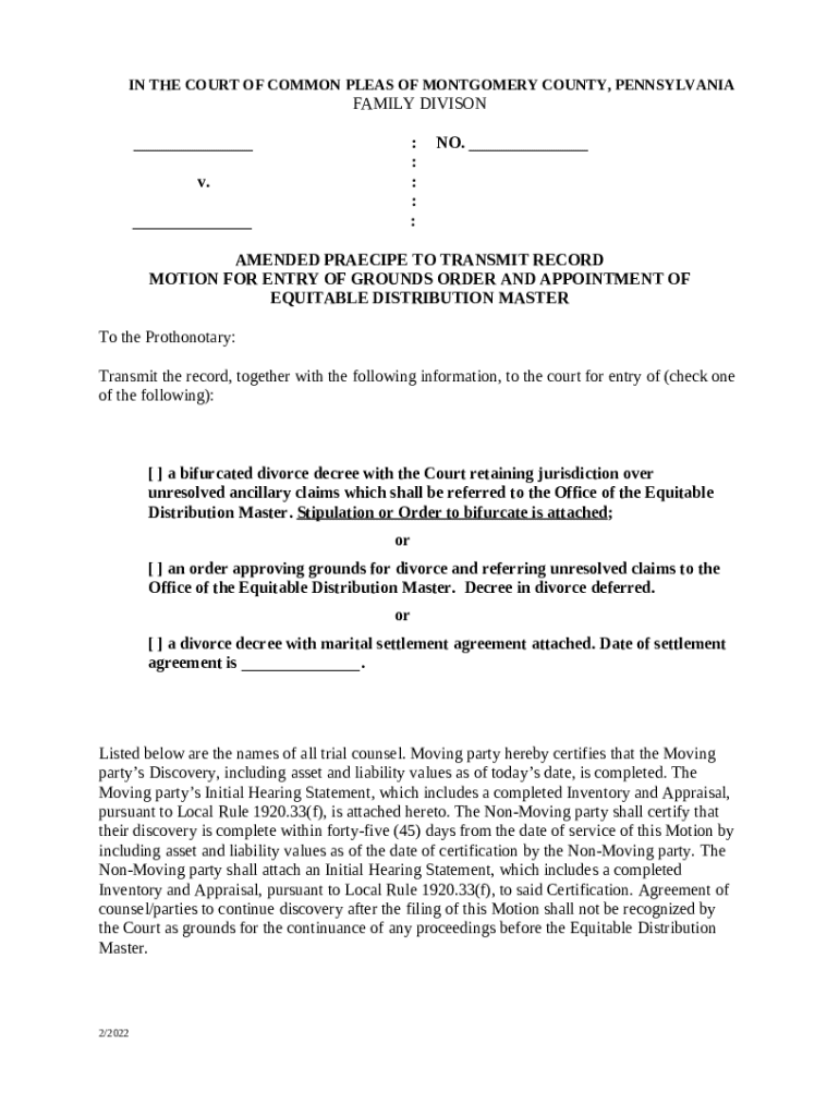 Get the free Amended Praecipe to Transmit Motion for Grounds Order and Appointment of Equitable D...