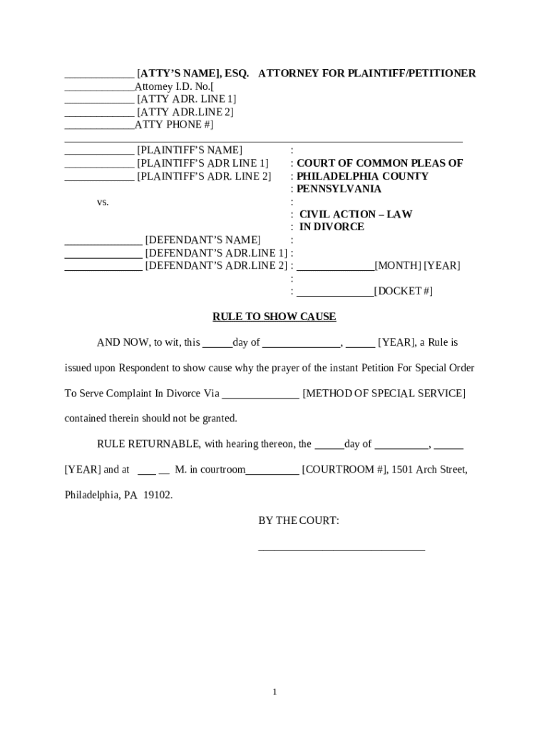 This Rule to Show Cause is requsting action as to why the prayer of the instant Petition For Special Order To Serve Complaint In Divorce should not be granted.