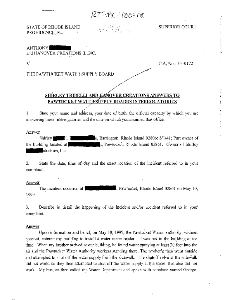 The document 'a08 plaintiffs answers to' refers to a formal set of responses provided by the plaintiff in a legal case to the defendant's questions or requests for information.