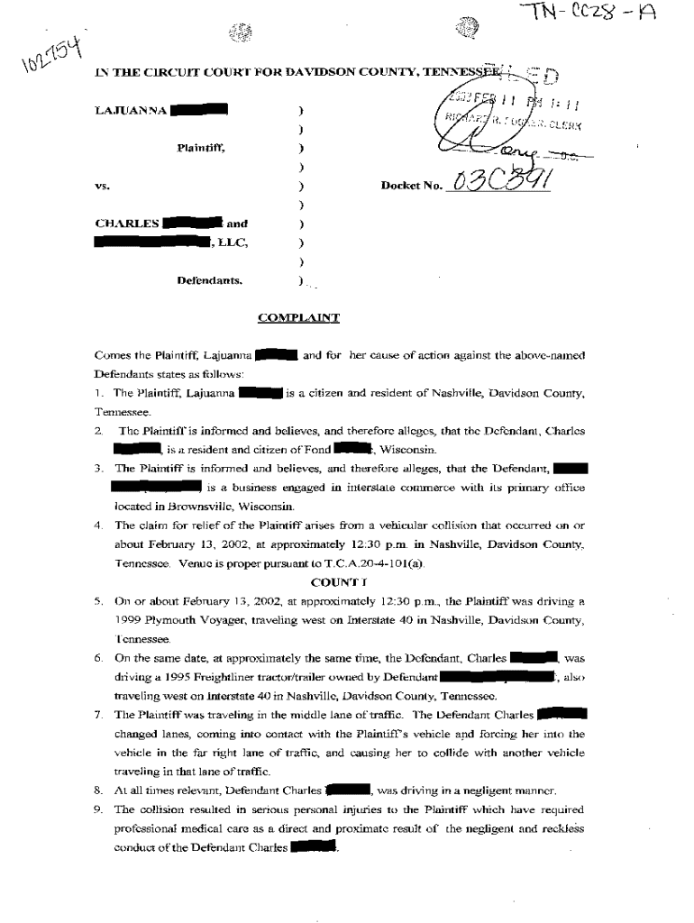Get the free A01 Complaint regarding collision with tractor trailer
