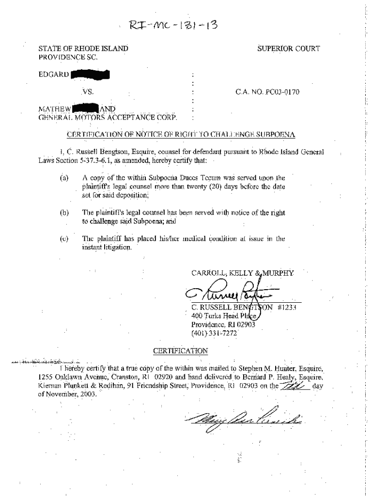 Get the free A13 Certificate of Notice of Right to Challenge Subpoena