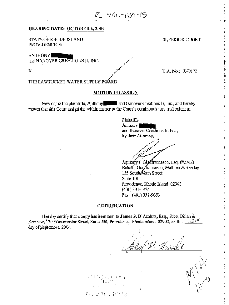Get the free A15 Motion to Assign Case to Docket for Trial