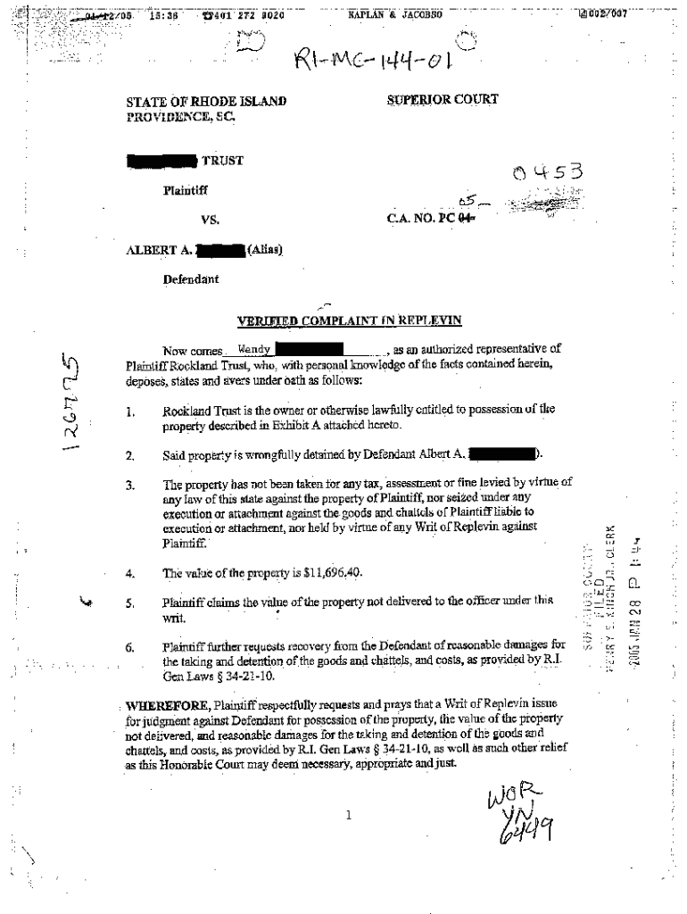 A01 Verified Complaint in Replevin of Property Wrongfully Detained