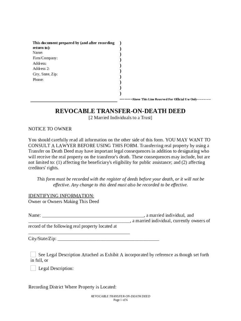 Get the free Transfer on Death Deed or TOD - Beneficiary Deed for Two Married Individuals to a Tr...