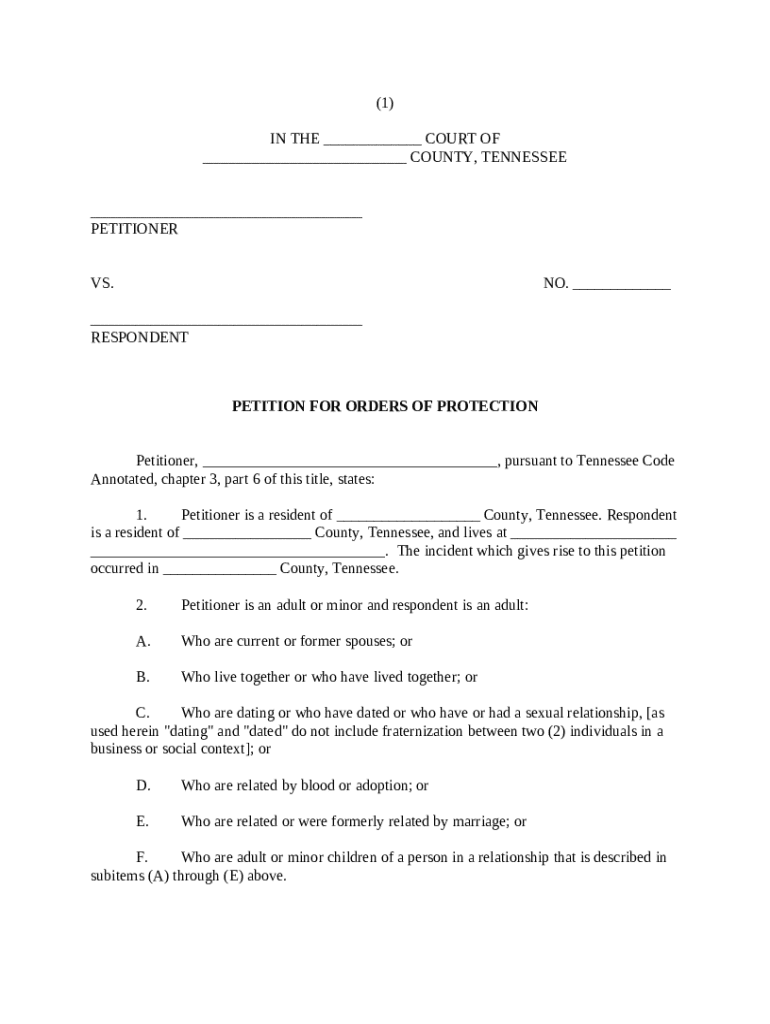 This is a sample form for use in Tennessee, a Petition For Orders of Protection from Domestice Abuse. Adapt to fit your circumstances. Available in standard formats.
