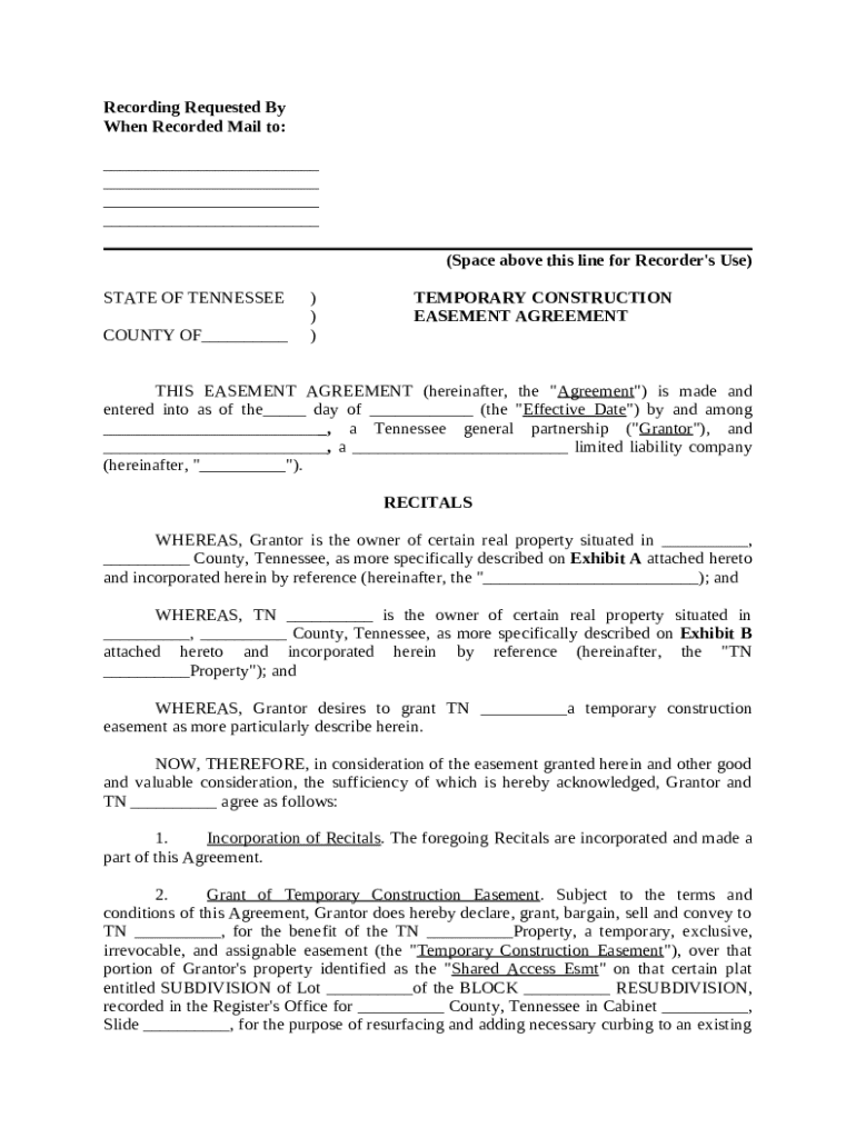 A temporary construction easement agreement is a legal document granting permission for temporary use of a property for construction purposes.