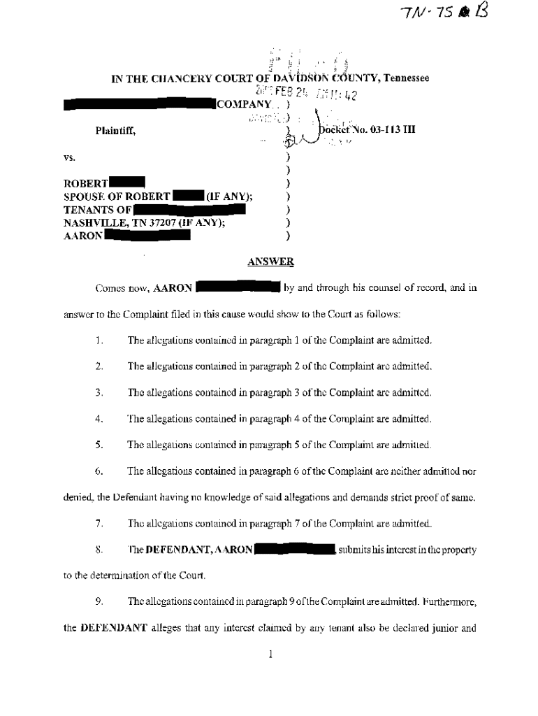A03 Answer to Complaint in Equity for Real Property of Deed of Trust