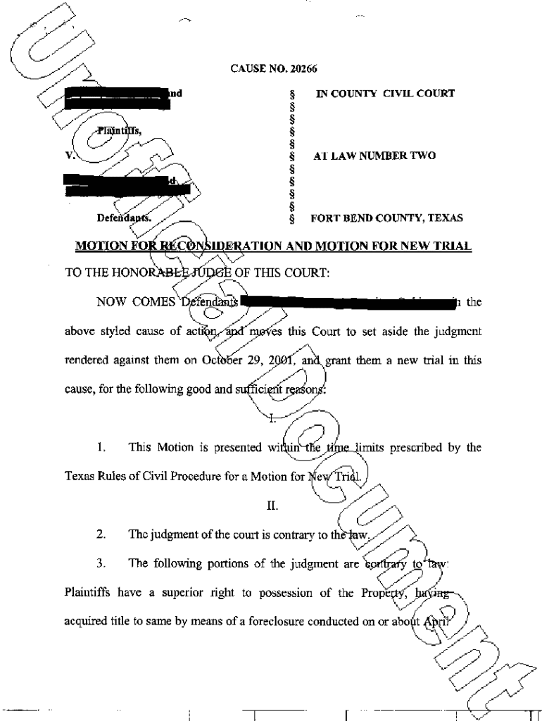 Get the free A20 Motion for Reconsideration and Motion for New Trial
