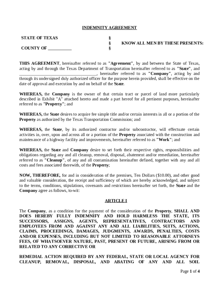 An indemnity agreement typically includes several critical components. The main parties involved are usually identified first, likely comprising a Company and the State in many contexts. Additionally, the agreement often describes the property involved (often outlined in an Exhibit A document) and details compensation considerations to ensure the agreement is legally enforceable.